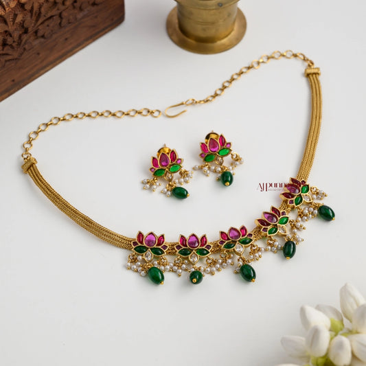 Lotus Necklace With Green Beads Hangings