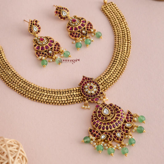 Krishna Kundan Jadau Invisible Necklace - Green with White