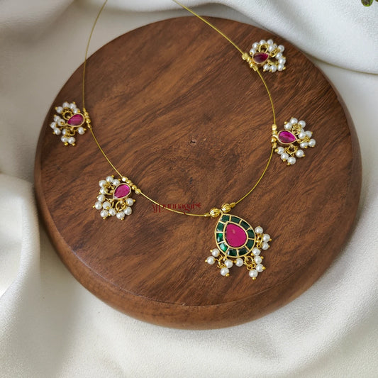 Teardrop Kundan Jadau Invisible Necklace - Green with Pink