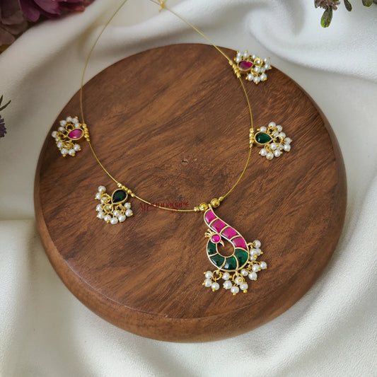 Beautiful Peacock Kundan Jadau Invisible Necklace - Green With Pink