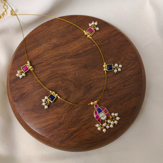 Jhumka Shaped Kundan Jadau Invisible Necklace - Pink with Blue