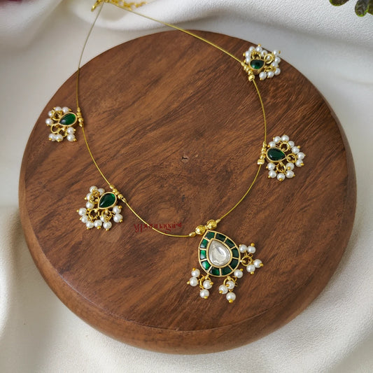 Teardrop Kundan Jadau Invisible Necklace - Green with White
