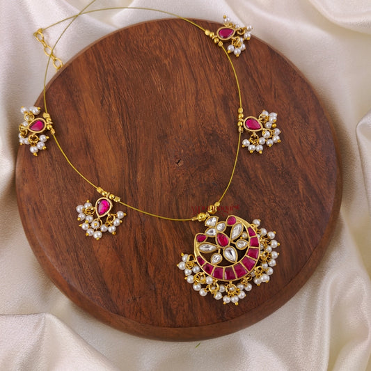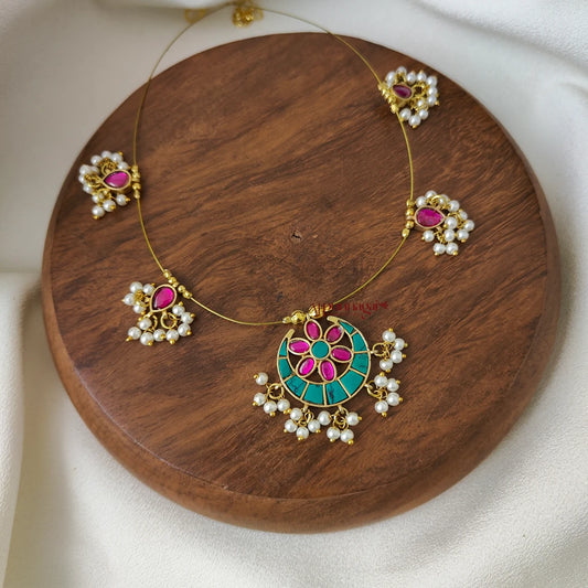 Moon Shaped Kundan Jadau Invisible Necklace - Turquoise With Pink