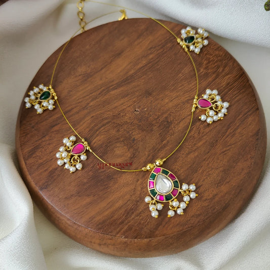 Teardrop Kundan Jadau Invisible Necklace - Pink with Green
